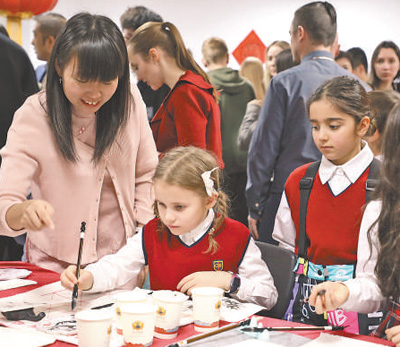 “同庆中国年 感受中国风”活动2月在俄罗斯莫斯科剑桥国际学校举行。图为该校学生在中国老师指导下体验中国书法活动。 人民日报记者 肖新新 摄